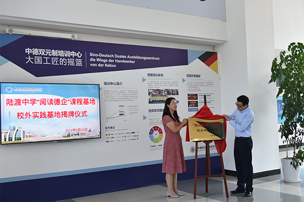 5月23日下午,陆渡中学校长陆金华和校副校长周晓刚,共同为陆渡中学“阅读德企”课程基地校外实践基地揭牌。同来的该校初三(9)班师生50多人来参观了中德培训中心和吴健雄陈列馆。