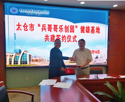 10月16日上午,太仓市“兵哥哥乐创园”健雄基地共建签约仪式在健雄学院举行。市退役军人事务局副局长蒋建东、健雄学院副院长周晓刚、职业发展教育中心主任霍彧参加签约仪式。