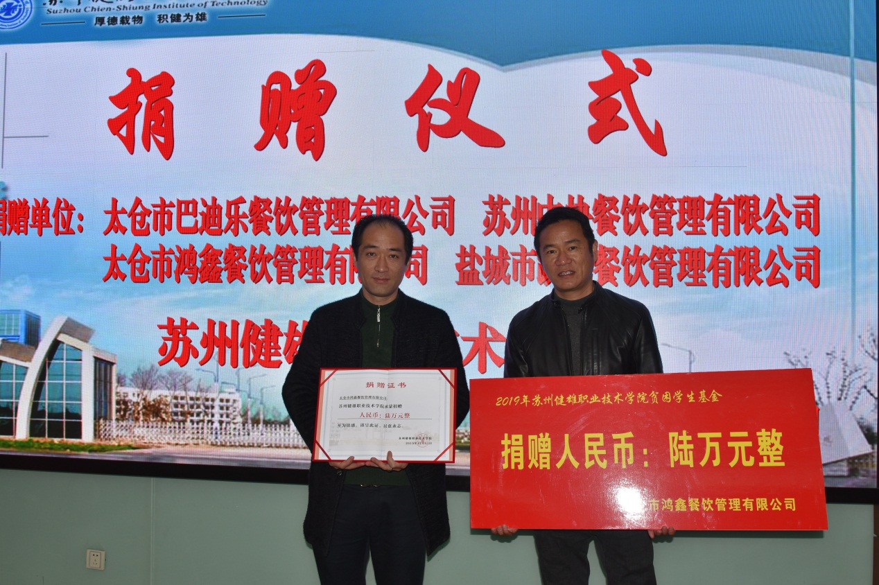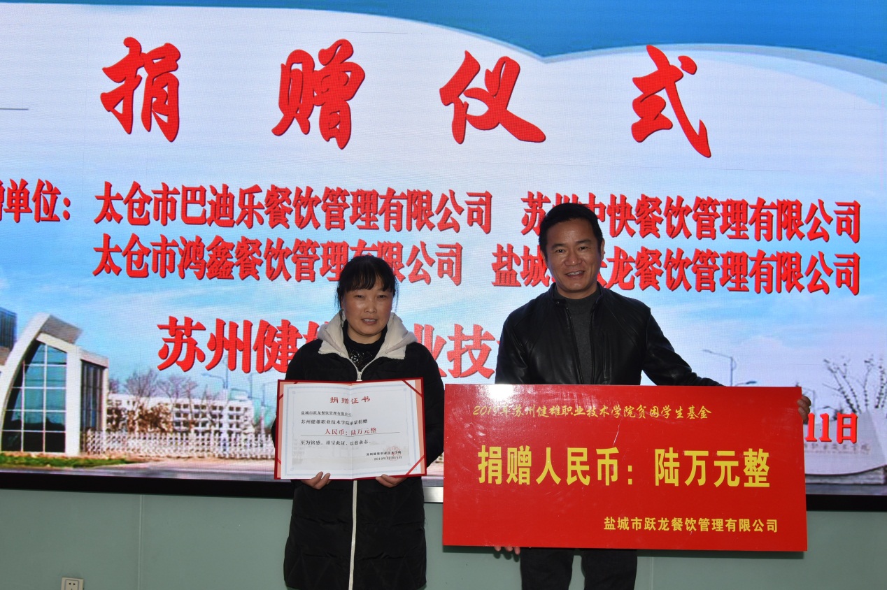 12月11日下午,太仓市巴迪乐餐饮有限公司等校内后勤服务企业为校贫困学生基金捐款24万元,资助贫困学生完成学业。校财务总监史菊林为捐款单位颁发荣誉证书。
