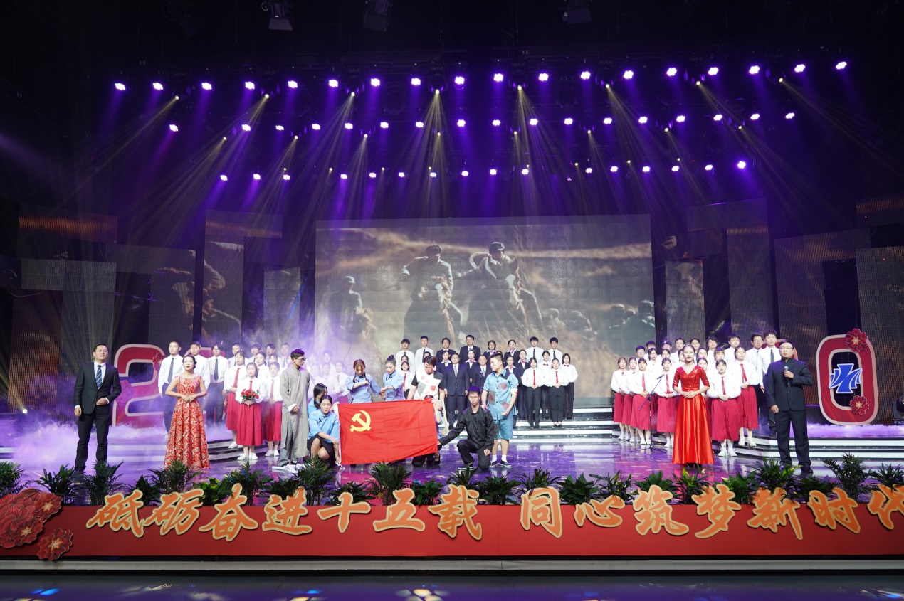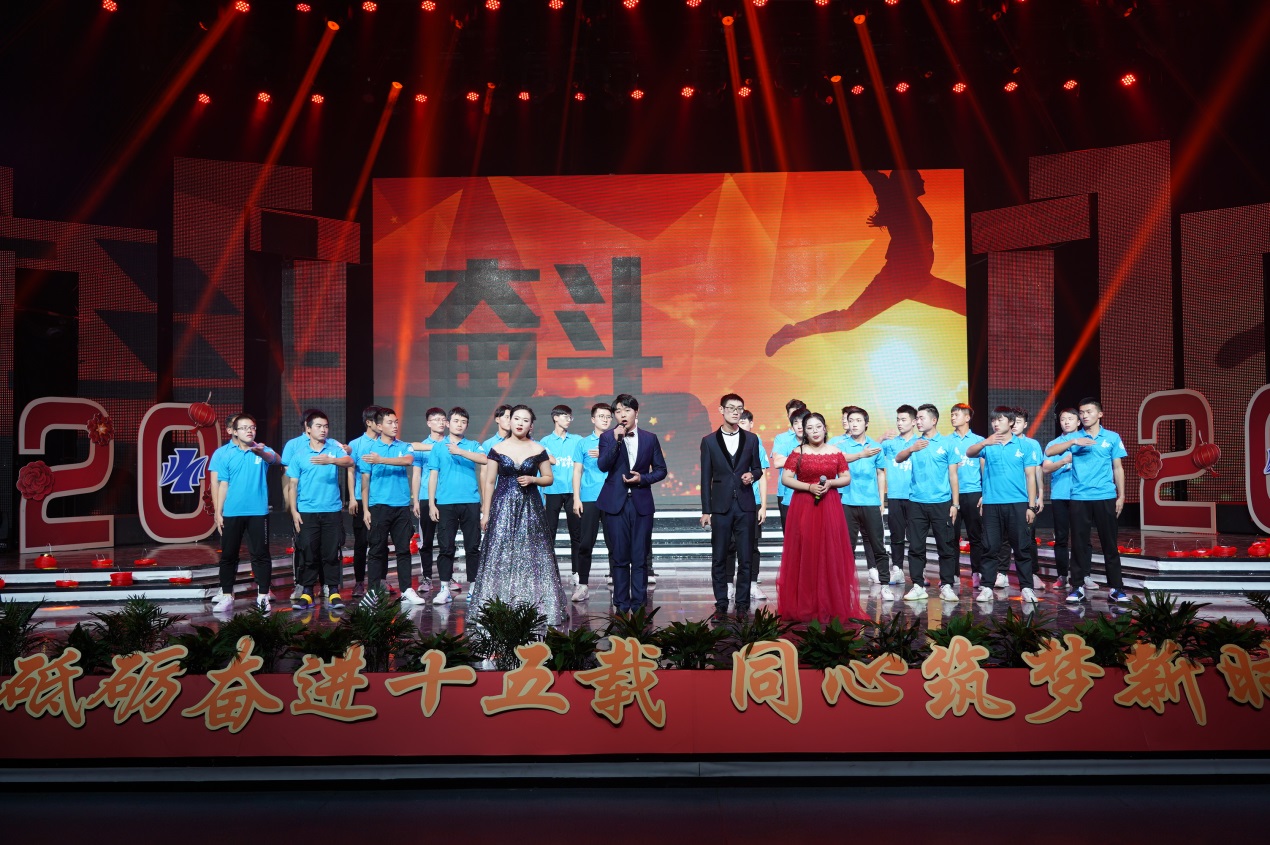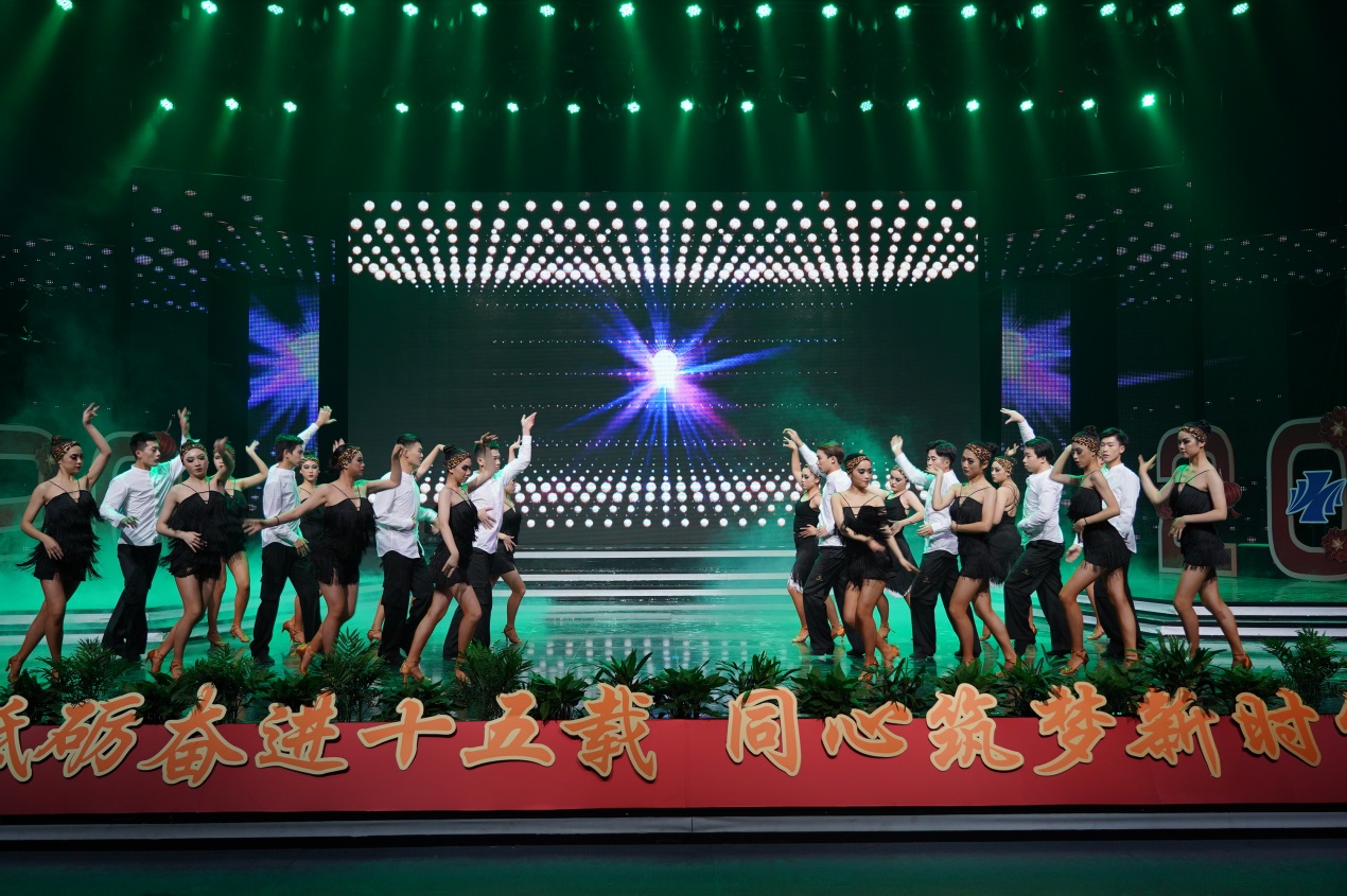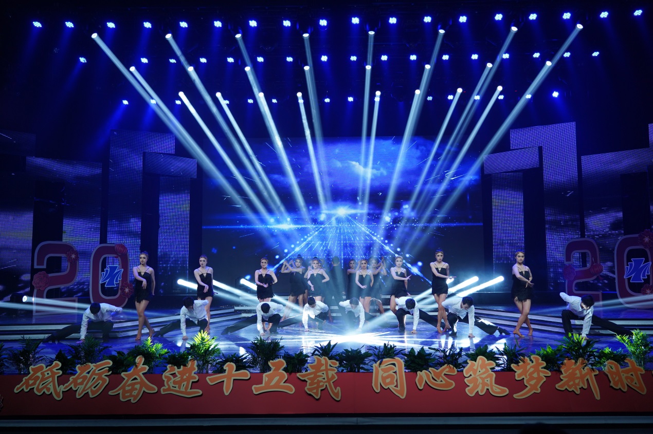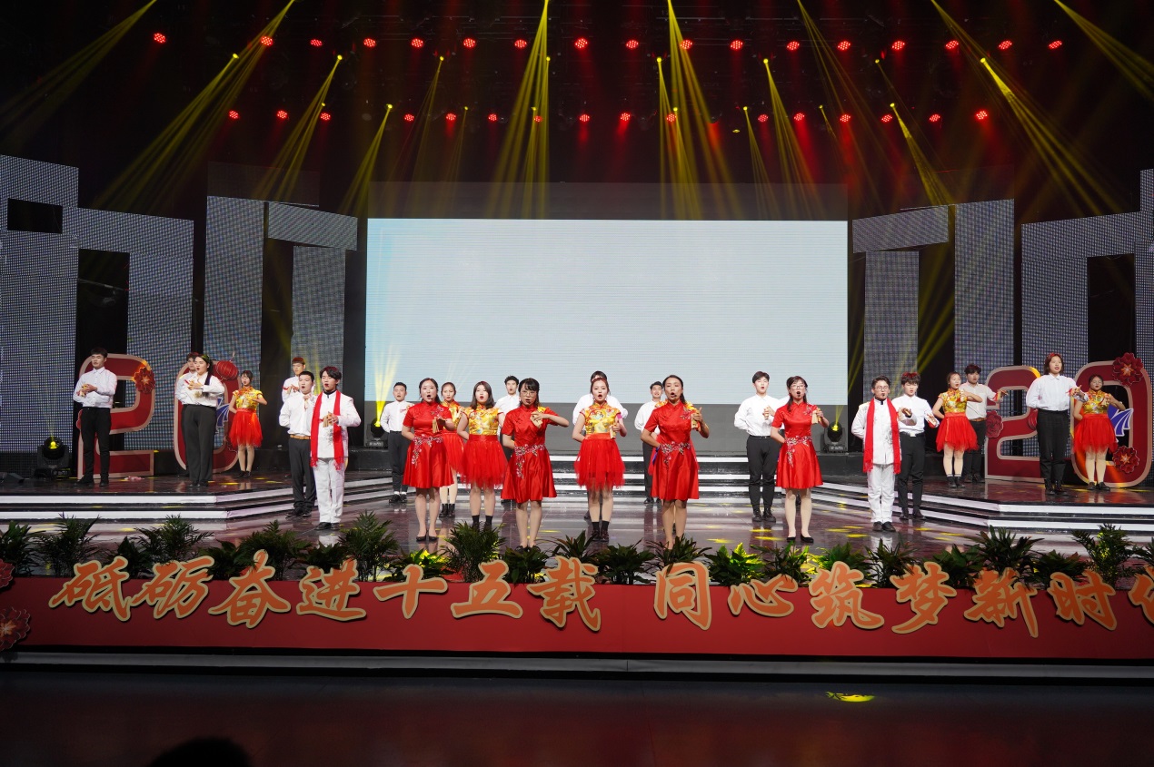 近2个小时的演出由缘聚健雄、情系娄东和梦圆时代三个篇章组成,共12个节目。演出的歌舞、相声、小品、合唱等都是教职工们自编、自导、自演的,反映了他们较高的艺术修养和对生活的热爱、对事业的追求和对学校的深情。演出在群舞《茉莉花开》中拉开序幕,参演的年轻女教师手持小雨伞翩翩起舞,仿佛一曲优美的水乡情歌,令人陶醉;相声《如此教授》通过幽默的语言、风趣的表演反映出我校今年取得的工作成绩,也反映出广大教职工立足岗位、奋勇争先的精神状态,给人留下深刻印象;小品《社招那些事》紧跟学校发展步伐,富有时代气息,艺术地再现了我校招生工作、职业教育工作蓬勃发展的美好景象;诗朗诵《盛世中国》气势磅礴,催人奋进,激励人们同心筑梦,奋斗新时代;拉丁舞《这时的我们》富有时代气息,让人们感受到年轻的力量、激情和希望。大合唱《我和我的祖国》把晚会推向高潮,“我和我的祖国,一刻也不能分离,无论我走到哪里,都流出一首赞歌……”这支由校领导带领全体中层以上干部合唱的歌曲唱出了全体师生的心声,她是2019年庆祝建国70周年回荡在健雄校园的主旋律。(图/文 何寿林)