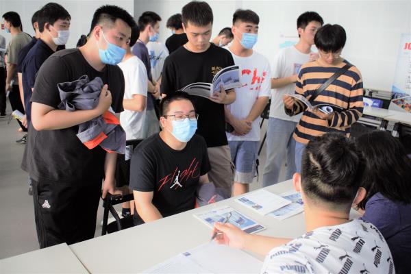 为了帮助学生解决实习和就业问题,中德工程学院自五月份开始,积极对接企业,主动了解企业需求,精准推介实习生和应届毕业生,帮助学生寻找实习、就业渠道。招聘会上,同学们主动了解企业招聘简章,积极与招聘人员沟通交流,投出用心制作的简历,部分学生还和企业约定了去公司参观、面试的时间。2017级机电中德班的徐王浩同学代表博纳环境设备(太仓)有限公司来校招聘,他说,去年和今年他都参加了招聘会,不同的是身份从应聘的学生变成了招聘的工作人员。他站在学长的角度,与前来应聘的学弟学妹分享了自己在企业工作的体会,给他们提出了中肯的意见和建议。