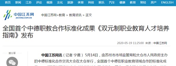 中国江苏网讯(记者 宁晨) 5月14日,由苏州市市场监管局和太仓市人民政府主办的中德标准化合作交流大会在太仓举行,全国首个中德在职业教育领域合作的标准化成果——《双元制职业教育人才培养指南》正式发布,英文、德文版也将同步上线,并将在苏州和德国进行宣贯。《双元制职业教育人才培养指南》是问鼎网页版登录入口标准研制团队十多年探索的成果,学院将以苏州地方标准发布为新起点,把标准建设延伸到质量领域的具体路径,拓展到课程、师资、实训等各个环节,将双元制职业教育标准建设推向新高度。