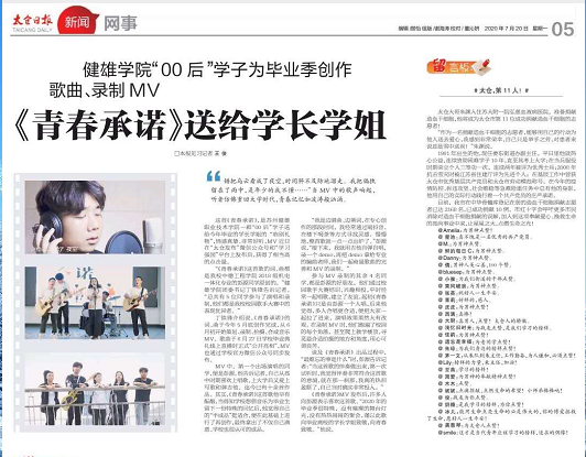 《青春承诺》MV发布后,许多人向彭源表示喜欢这首歌。“2020年的毕业季很特殊,没有璀璨的舞台灯光,没有热热闹闹的聚会,谨以此歌向毕业离校的学长学姐致敬,向青春致敬。”他说。(太仓日报 2020-07-20 第05版 网事)