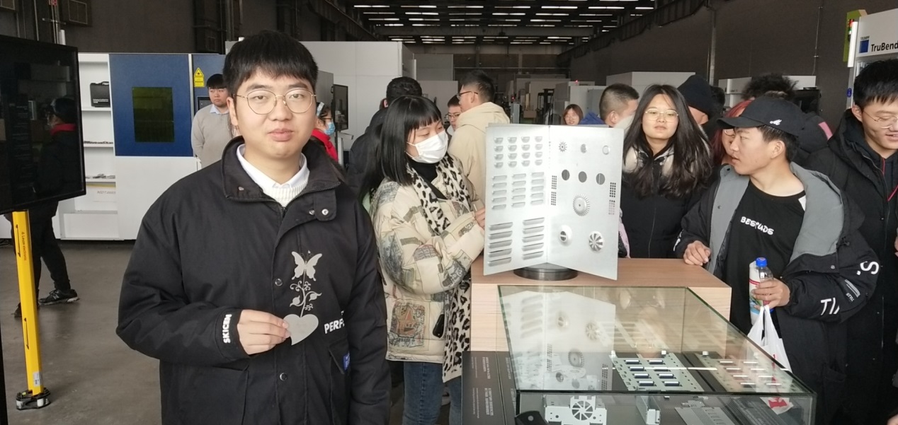 在通快公司同学们认真倾听了公司发展的历程与发展前景,并在机床事业部生产车间观察了高档数控激光切割机床的操作与控制,在现场工程技术人员的介绍与鼓励下,大家还亲手切割与小象、通快徽标等作品,进一步感受到了德资企业先进制造技术的魅力。在企业生产现场,工程技术人员把刚刚切割成型的作品作为实习礼物送给了同学们,引起大家浓烈的兴趣与学习热情。参观实习结束后,大家高兴的在企业门**影留念。