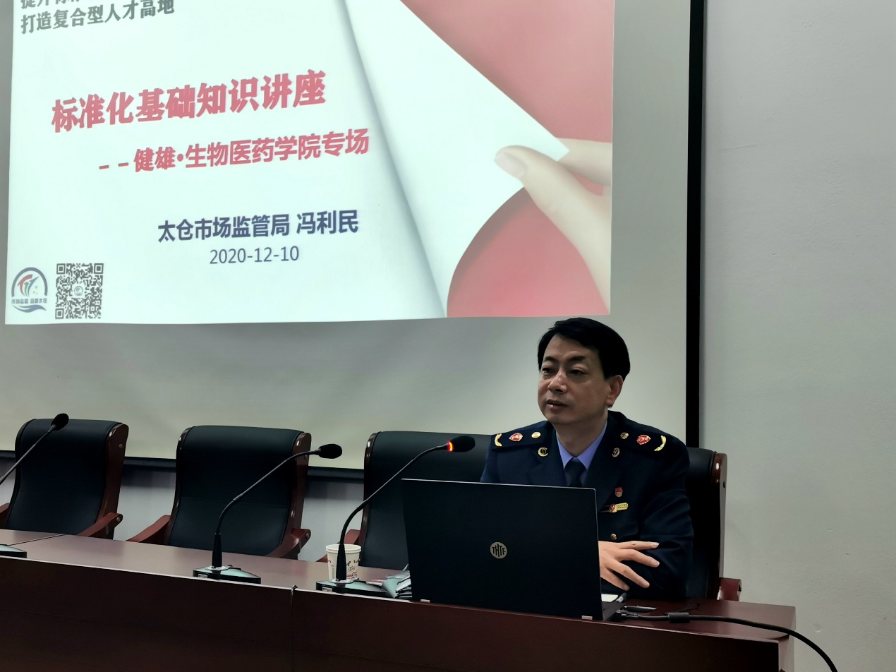 12月10日下午,生物医药学院(筹)标准化基础知识专题讲座在D3-408教室举行,太仓市市场监督管理局科长冯利民应邀担任主讲。生物医药学院全体教师、部分学生到场聆听讲座。讲座由党总支副书记贾红圣主持。