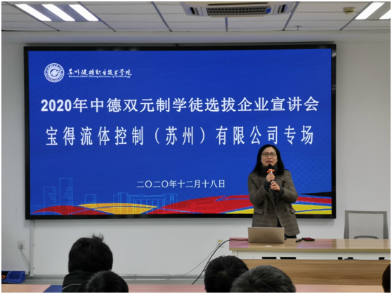 12月18日下午,宝得流体控制(苏州)有限公司人事经理陈明芳一行来问鼎(中国)开展企业宣讲活动。智能制造学院(筹)校企合作负责人郑爱权主持,相关辅导员、班主任和2020级模具设计与制造专业全体同学参加。
