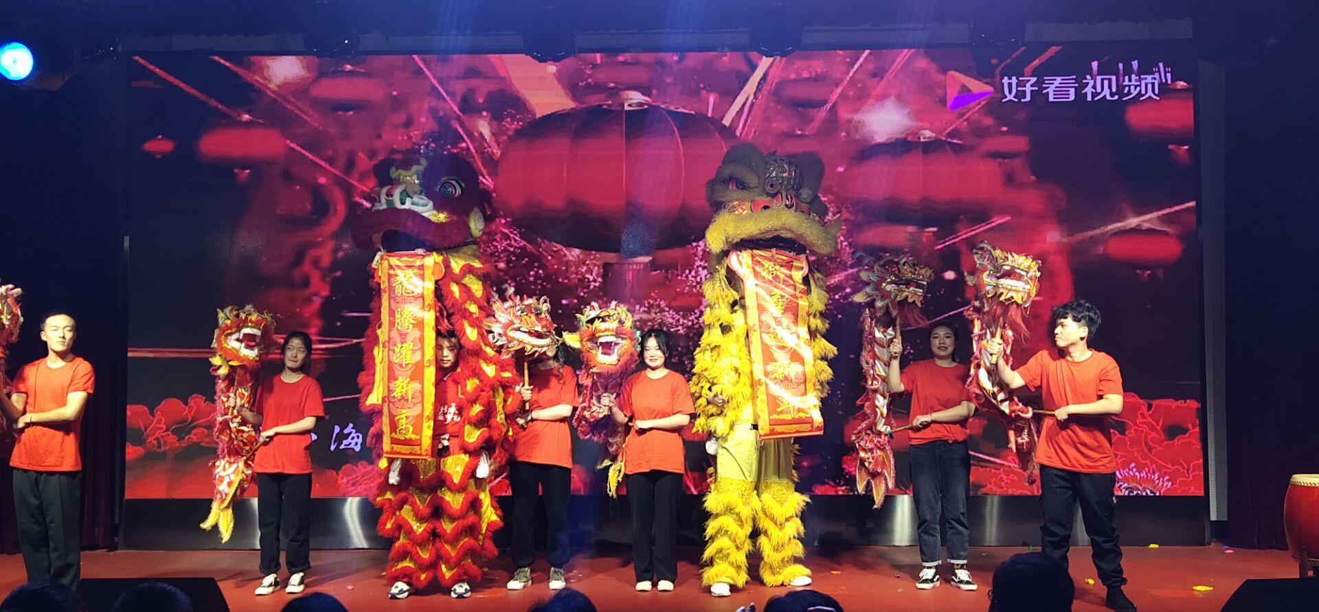 晚会接近尾声,龙狮社带来的《舞龙狮、迎新年》把晚会的气氛再次点燃。六条赤龙腾云而来,在舞台上空盘旋。栩栩如生的龙身仿佛身披金光,灵动优美的身影引得观众们啧啧称奇。锣鼓盈天,赤龙退场,一红一黄两只憨态可掬的舞狮跃上舞台,扑闪着两对铜铃般的大眼睛,一会儿蹦一会儿钻,摇头摆尾,好不热闹。观众纷纷喝彩,迎新晚会在喜气洋洋的气氛中圆满结束。