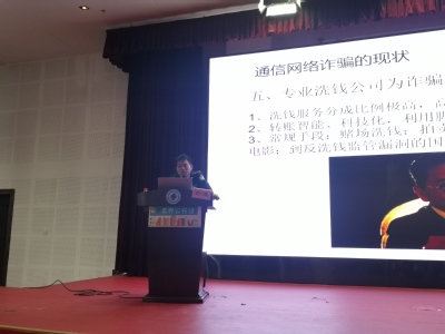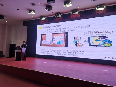 俞进警官是一位从事电信网络新型违法犯罪工作近9年的一线“老”警官,他说,前不久,他刚破获一起新的网络诈骗案件。宣讲中,俞警官通过最新的数据,案例,生动具体的向在场的同学们讲述犯罪分子是如何通过利用人的侥幸心理等因素诈骗成功的,并把犯罪分子常用的工具,手段等,详细向同学们进行讲解。在场的同学都被一个个真实新奇的案件内容吸引,大家目不转睛的盯着大屏幕上展示的内容,认真聆听学习。在观看了俞警官特地下载的视频并聆听了讲解之后,很多同学们陌生的网络法治安全内容都变得易懂起来。