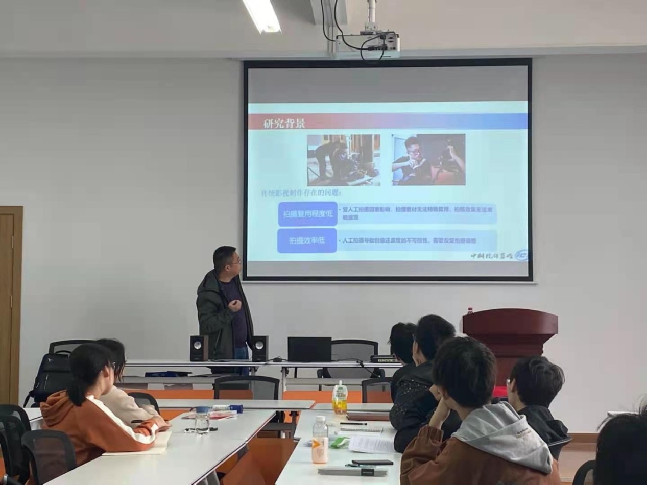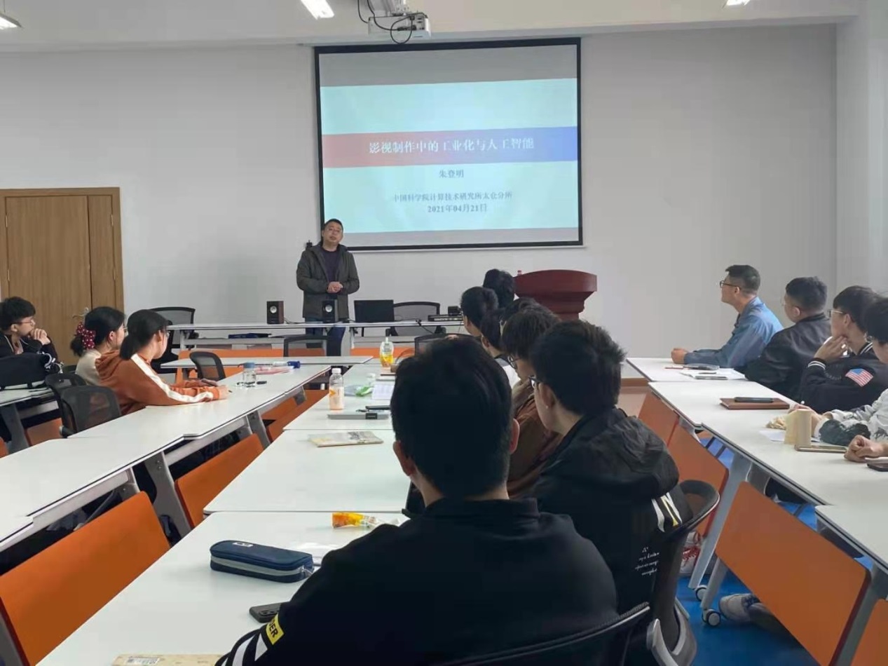 朱登明先生讲座的选题是“影视制作中工业化与人工智能”,该主题以人工智能技术为导向,遵循学生的兴趣发展。讲座以近代电影为起点,以好莱坞、迪士尼等大型电影制作公司为案例,使用视频、动画、实景等多样化呈现方式,朱登明先生讲述了如何使用VR虚拟技术、动作捕捉技术、机器学习、机器视觉等人工智能技术实现电影制作的工业化与智能化;并从自身的学习背景、工作实践经历出发来告知学生人工智能技术的发展历程以及未来的发展趋势,同时它可能带来的就业前景,并发出期许,希望学生们能沿着这条黄金赛道努力并坚持走下去。