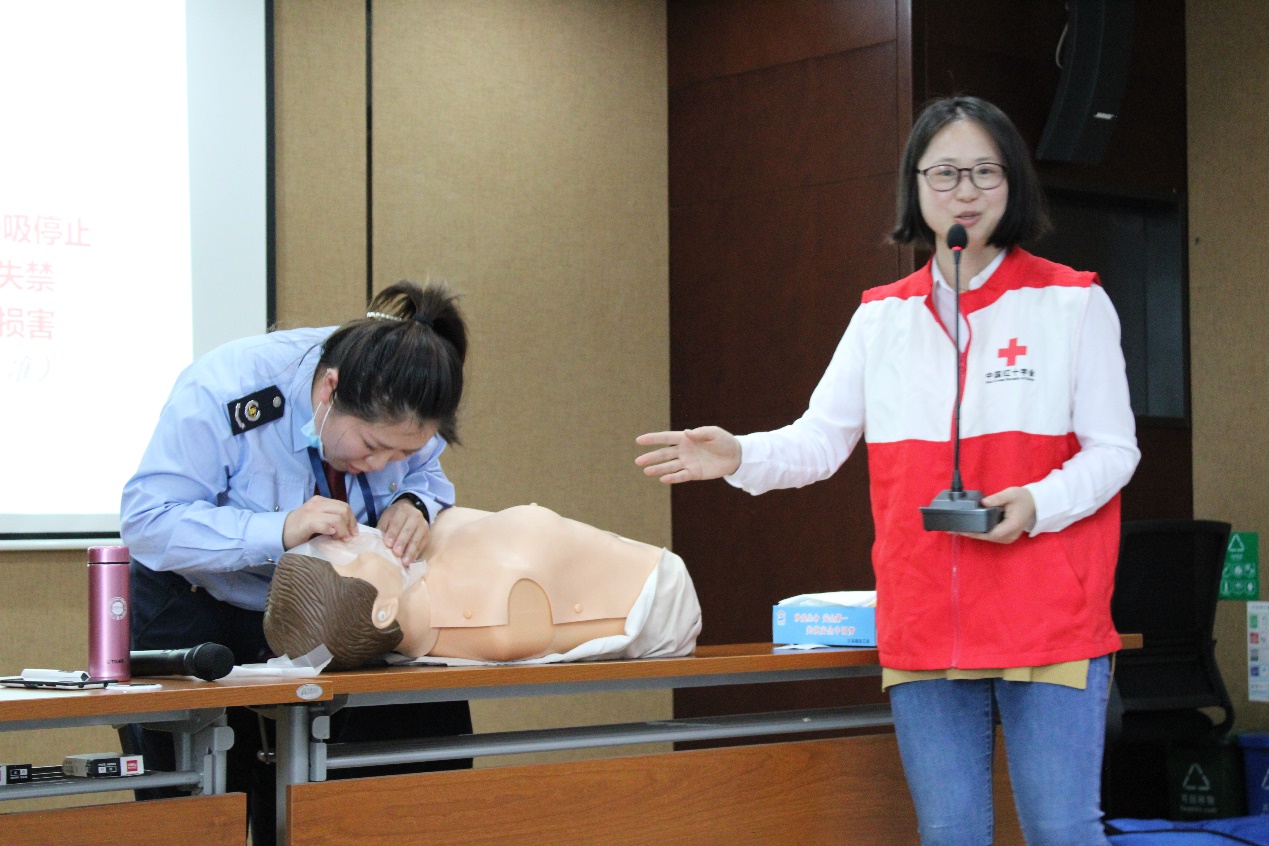 具有红十字会应急救护培训师资质的培训师们用通俗易懂的语言,重点讲解并演示了心肺复苏实际操作要点,包括判断意识是否丧失、规范教授胸外心脏按压、清理口腔异物、开放气道、人工呼吸等环节。在培训师们的指导下,每一位参训人员都反复练习了心肺复苏操作的各项动作要领。此次心肺复苏急救培训,旨在通过对政府行政部门一线窗口工作人员应急救护知识和技能的培训,增强其急救意识,提高他们对突发事件的应急处理能力。