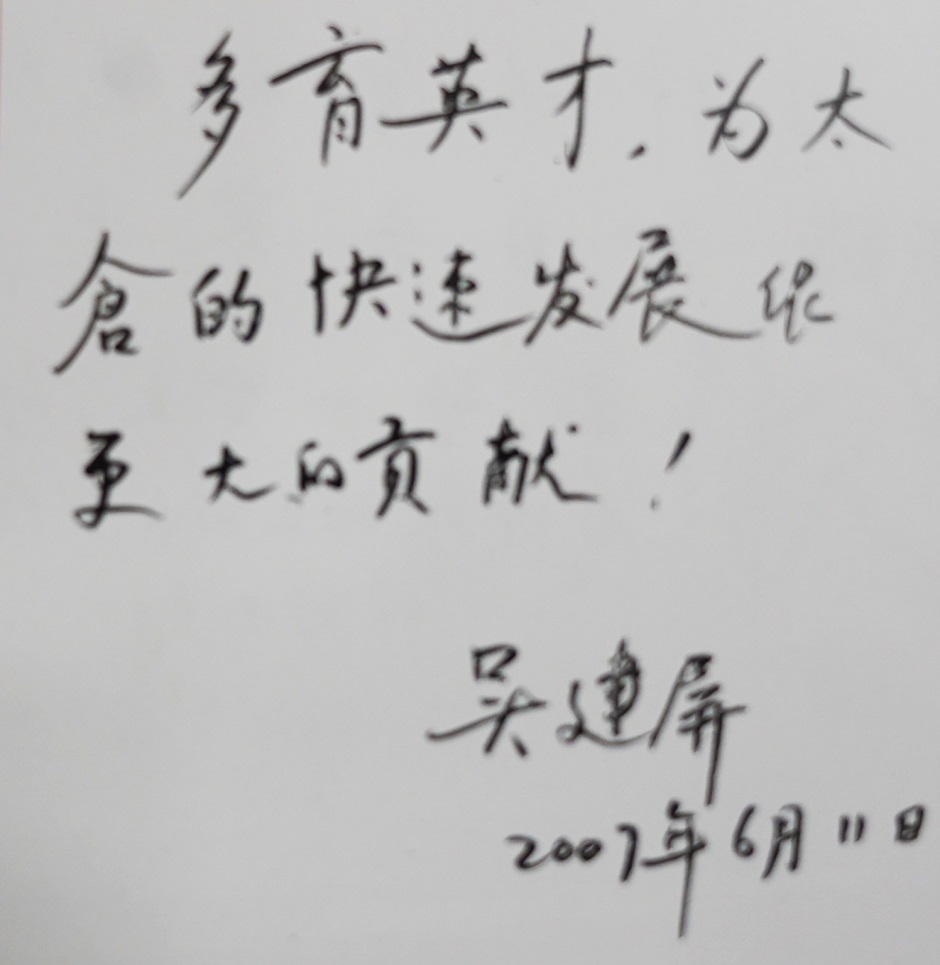 2007年6月,吴建屏出席吴健雄诞辰95周年纪念活动暨健雄职业技术学院新校区落成典礼,他为新校区落成题词: