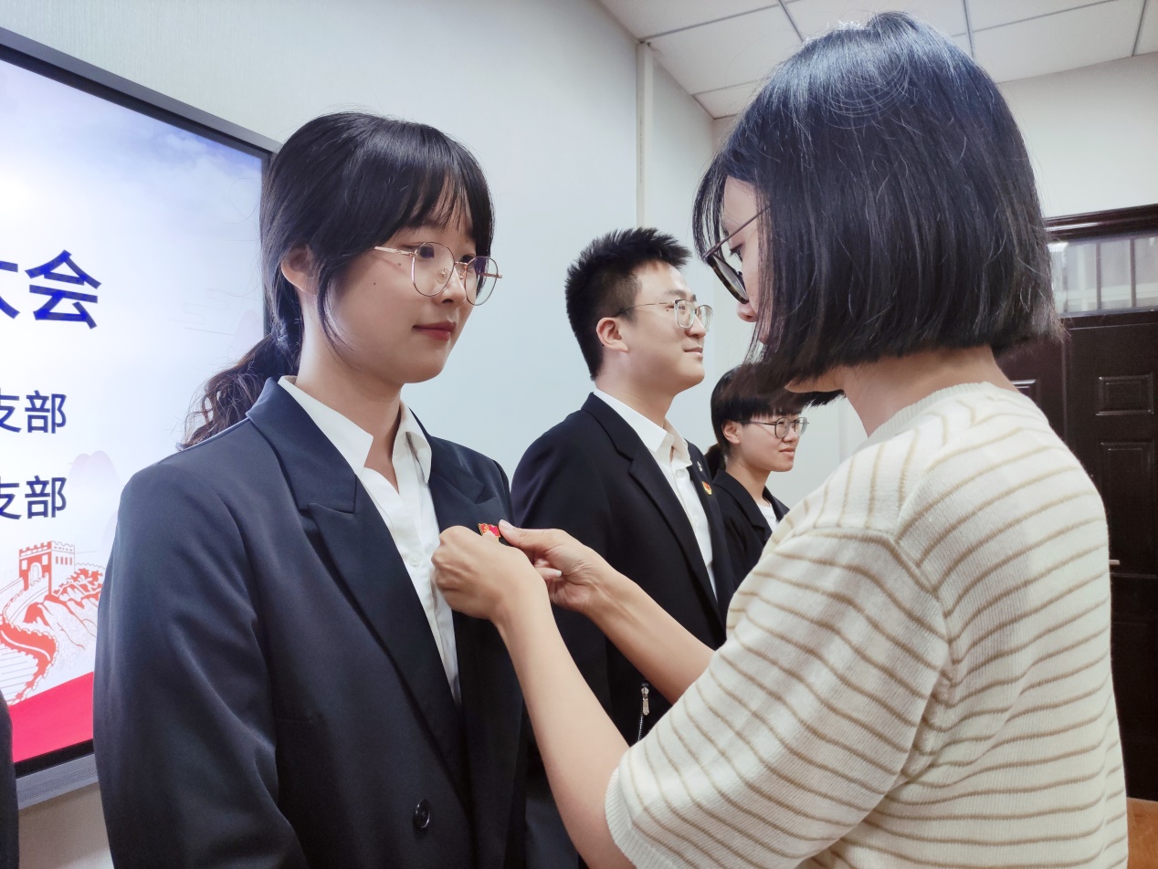 会议的主要议题是讨论和审议李澳等六位同志的入党问题,按照:拟发展党员宣读入党志愿书,入党介绍人和与会的其它党员充分讨论发展对象的入党问题,陆佳同志代表支委会介绍发展对象的函调、答辩、公示情况等,全体正式党员填写表决票和通过支部大会决议等程序进行。经过无记名投票表决,一致同意接收李澳等同志成为中共预备党员。随后,戈薇同志为新入党的同志佩戴党徽,陆佳同志带领全体党员面向党旗庄严宣誓,重温誓词。