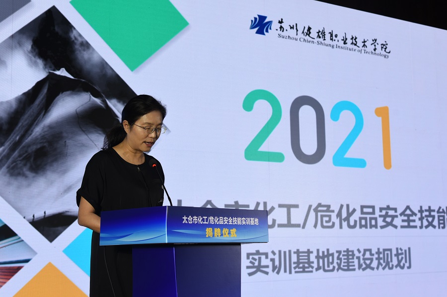 杨益忠在致辞中表示,太仓市化工(危化品)安全技能实训基地成立,体现了地方政府对安全工作的重视,是太仓应急管理局积极深化企业安全培训、发挥职业教育在安全工作中作用的有力举措,是健雄学院产教融合特色办学的高水平示范和实践探索,希望基地根据地区产业情况和培训对象需求,强化危化品行业安全技能培训,发挥服务地方经济发展的作用。