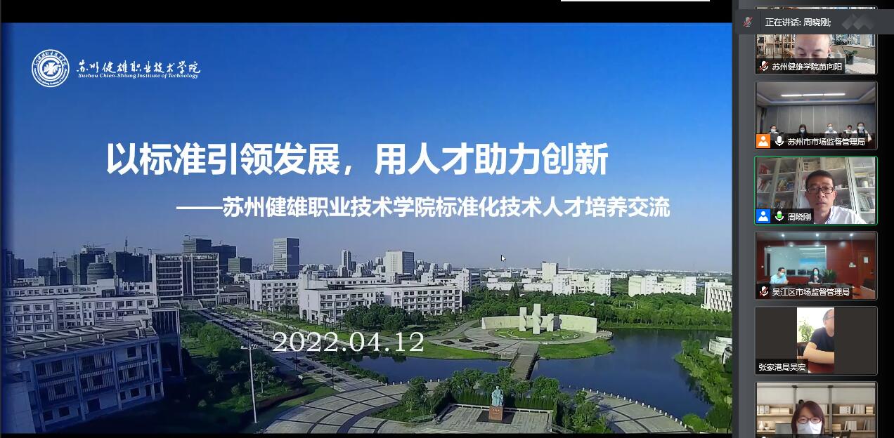 2022年4月12日,我校参加了苏州市标准化人才培养研讨会。会议采用线上视频方式召开,苏州市市场监督管理局组织了各市、区市场监管局分管局长、标准化科主要负责人,以及各市、区10家标准化基础较好的企业参加研讨。我校周晓刚副院长代表学校做了《以标准引领发展,用人才助力创新》的交流发言。