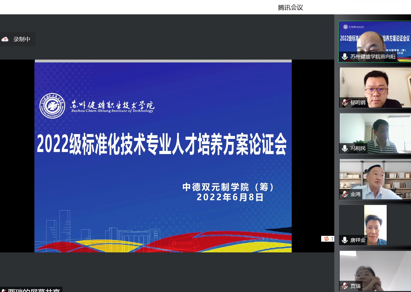 2022年6月8日,双元制学院召开2022级标准化技术专业人才培养方案线上论证会,邀请南京信息职业技术学院金鸿教授、苏州工业职业技术学院唐祥金教授、山西省质量与标准化院郁鸣钢高级工程师、 深圳技术大学质量与标准化院科研主管吴婕妤老师、太仓市市场监督管理局冯利民科长担任论证专家,双元制学院副院长苗向阳教授主持会议。