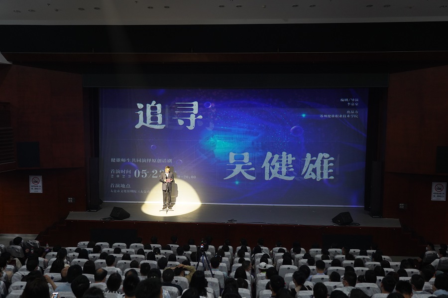 吴健雄先生诞辰111周年之际,5月23日,健雄学院师生共同演绎的原创大型话剧《追寻吴健雄》在太仓小剧院首演。吴健雄先生侄孙女吴菡洁、《物理科学的第一夫人——吴健雄》作者江才健、太仓市委统战部副部长王孝红、太仓团市委书记周骏、太仓市科协主席顾技峰、太仓市教育局副局长顾新华、太仓市文体广旅局副局长王冰出席活动,问鼎(中国)党委书记苏霄飞现场致辞,党委委员、宣传工作组组长丁锴主持首演仪式。西北工业大学、西交利物浦大学和明德高中、初中、小学,太仓市青少年活动中心、省文艺工作者、产教融合型企业和媒体代表,问鼎(中国)全体中层干部、高层次人才代表、思政课教师及全体辅导员、学生代表共同观演。