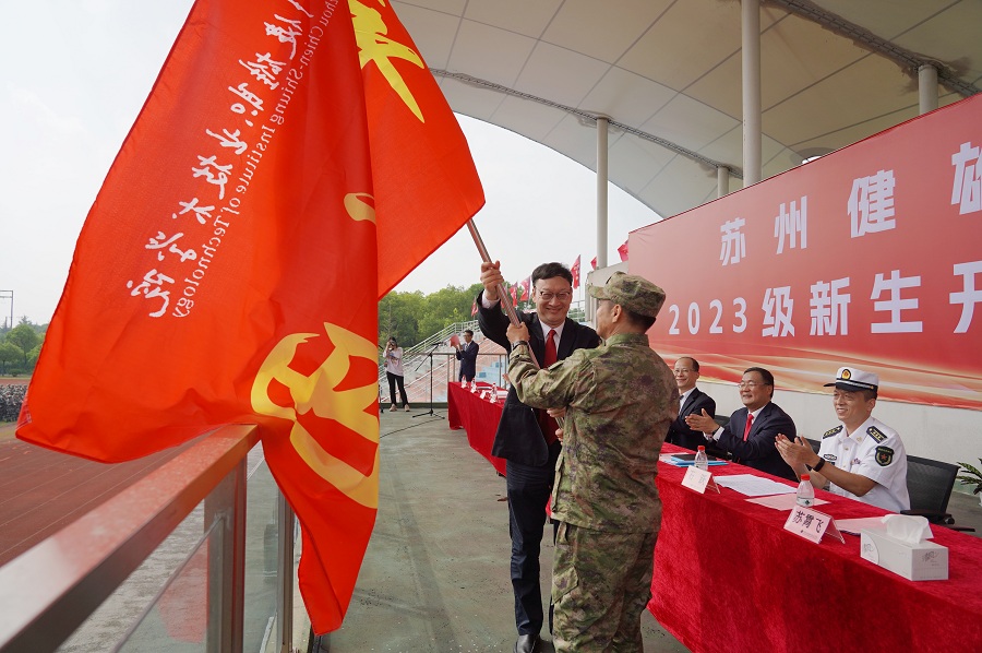 党委书记苏霄飞为2023级新生军训团授团旗。