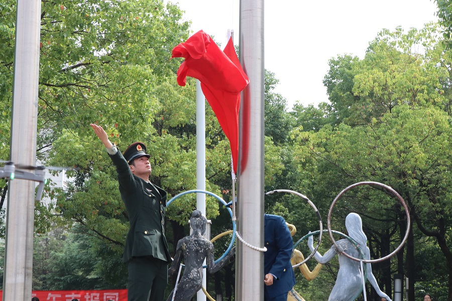 上午九点半,学院的田径场上响起庄严的国歌声,全场3000多名师生齐唱国歌,注目着五星红旗冉冉升起。
