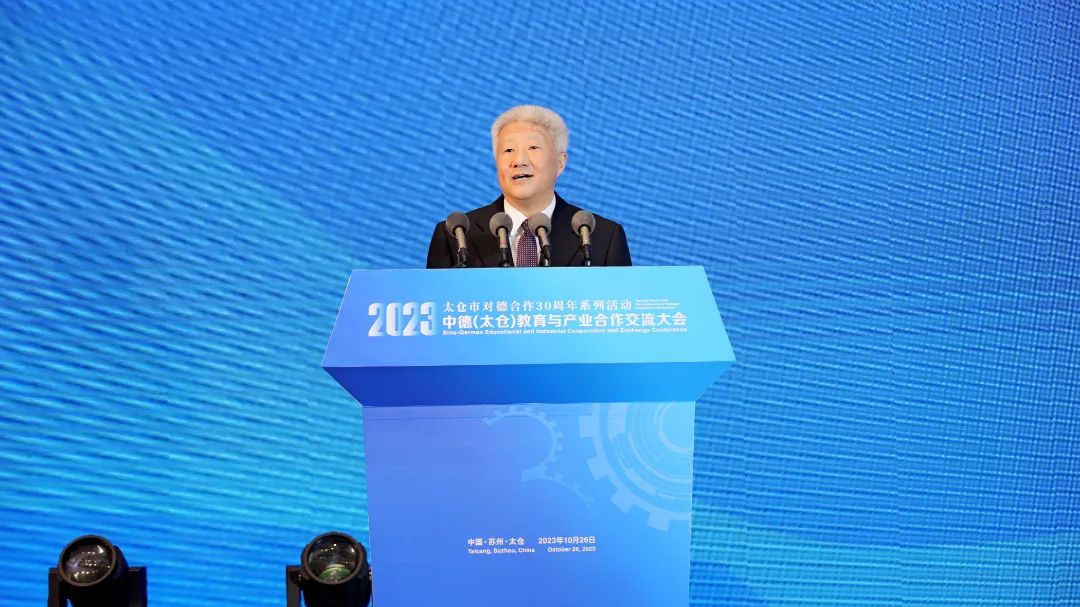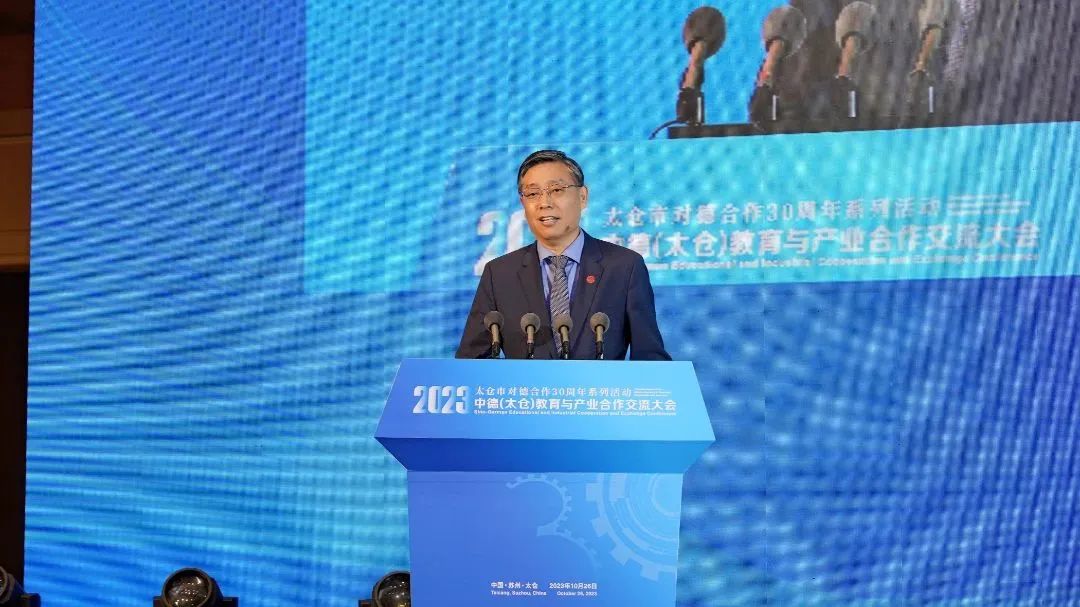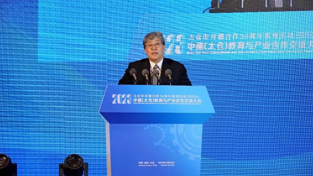 10月26日上午,2023中德(太仓)教育与产业合作交流大会在太召开,本次会议由江苏省教育国际交流协会、太仓市人民政府主办,问鼎网页版登录入口、江苏省太仓中等专业学校、中德职业教育产教融合联盟、江苏德国高职教育合作联盟承办。会议以“深化对德合作 产教协同发展”为主题,是太仓市对德合作30周年系列活动的重要组成部分。中国德国友好协会常务副会长、上海外国语大学党委书记姜锋,中国工程院院士、德国工程科学院院士吴志强,中国教育发展战略学会常务副会长康宁,中国职业技术教育学会常务副会长王扬南,江苏省教育厅副厅长曹玉梅,江苏省委统战部二级巡视员、江苏华职教社秘书长倪南,江苏省发展改革委二级巡视员郝琳,江苏省教育国际交流协会副会长、江苏省教育厅原副巡视员马幸年,苏州市副市长季晶,太仓市委副书记、市长徐华东,副市长倪嘉臻,健雄学院党委书记苏霄飞,党委副书记、院长林长永出席大会。同济大学发展研究院院长任浩、比勒费尔德中等企业应用技术大学副校长Torsten Fischer、江苏联合职业技术学院党委书记刘克勇等高校领导、企业专家等作交流报告。中德职业教育产教融合联盟、江苏德国高职教育合作联盟,以及来自中德两国院校、研究院所、企业、协会、商会等相关单位300多位嘉宾参会。
