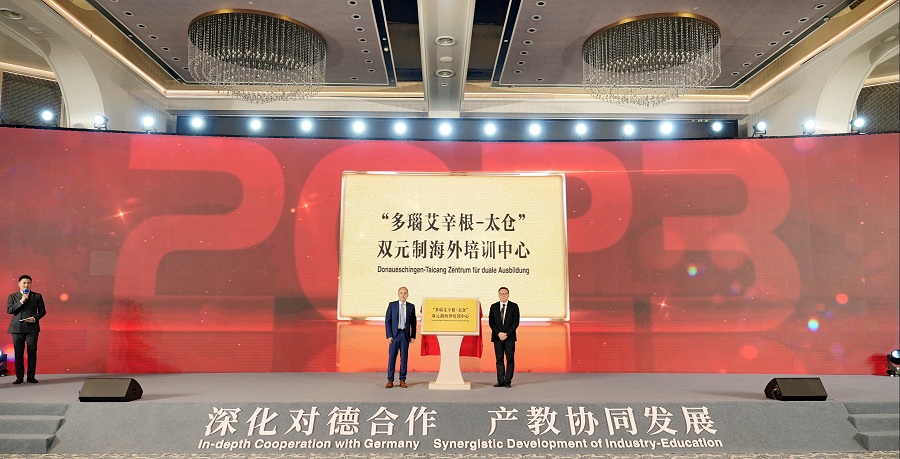 现场举行了揭牌仪式,国家职业教育研究院将与太仓市联合建立双元制创新研究基地,致力于探索中国特色双元制的发展之路。太仓与多瑙艾辛根职业学校共建“多瑙艾辛根-太仓’双元制海外培训中心”,旨在加强职业教育双向交流,深化专业合作建设,加强师资和学徒的共同培养。上海市欧美同学会留德语国家分会将在太仓设立创新中心,进一步凝聚太仓留德人才,促进上海与太仓留德人才的交流互动,为太仓深化对德合作建起信息交流、人才交流、资源交流的“金纽带”。