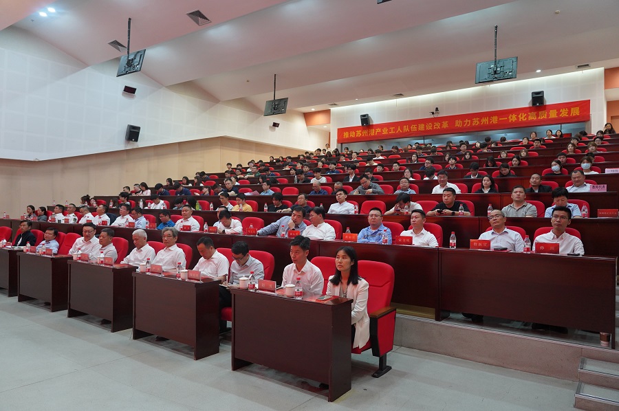 成立大会现场,领导嘉宾为苏州港工匠学院名誉院长、名誉董事、特聘讲师颁发聘书,为10家苏州港工匠学院首批实训基地授牌。揭牌仪式后,苏州港工匠学院劳模工匠特聘讲师褚锋为师生代表作《党领导下新时代产业工人的成长与蜕变》专题讲座。