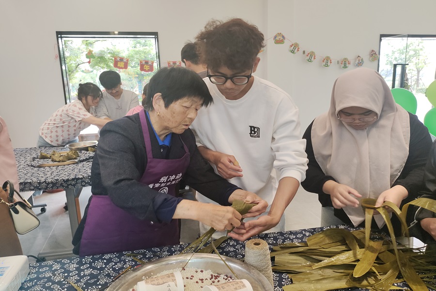 而在包粽子的环节,留学生们更是展现出了极高的热情和创造力。他们学着村民的手法,将糯米、红枣等食材包裹在翠绿的粽叶中,用细绳紧紧扎好。虽然初次尝试的留学生们手法略显生疏,但他们的认真和用心却让在场的所有人感动。经过一番努力,一个个形状各异的粽子终于完成了。