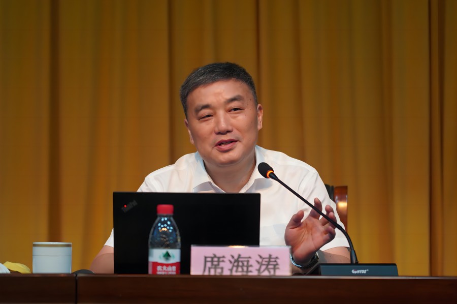 常州工业职业技术学院党委书记席海涛作题为《“五链耦合”推动产科教联动向深处走向实里行向高处攀 “专精特新”实现学校办学能力高水平、产教融合高质量》的报告。他从职业教育发展的“三问”入手,对产教融合、校企合作、市域产教联合体建设作了深度剖析。