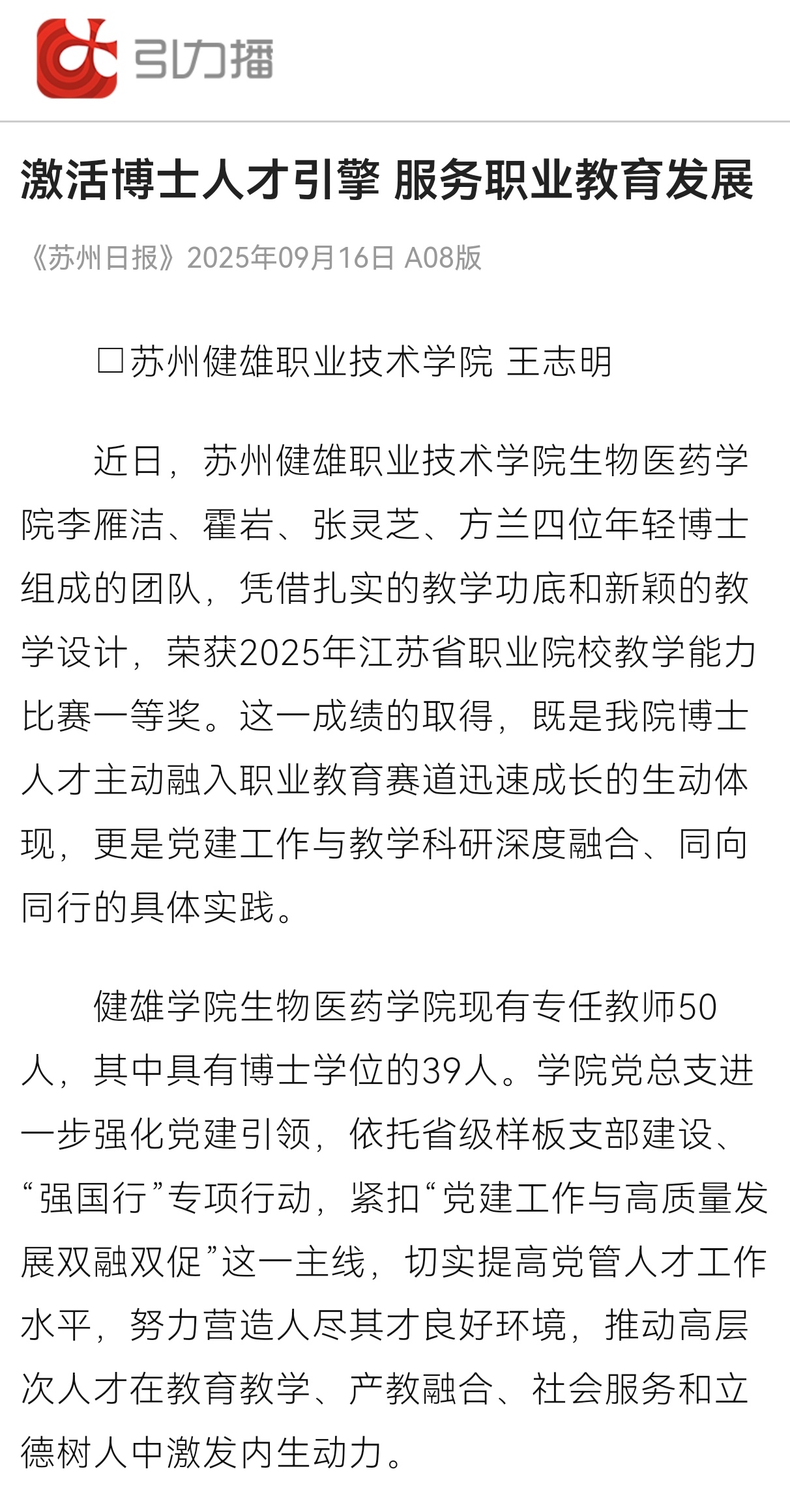 苏州日报 | 激活博士人才引擎 服务职业教育发展