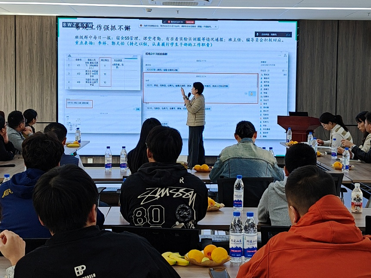 智能制造学院党总支副书记、24级舍弗勒项目班班主任吴成炎以“从新生到‘准技术骨干’的蜕变”为主题,向家长分享学徒一年间的成长历程,展示学生入学时的基础技能测评、班级技能考核通过率、评奖评优的结果,系统化呈现在双元制教育体系下学生成长路径。