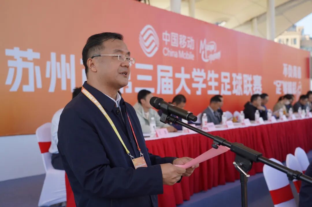 10月29日下午,“中国移动”苏州市第三届大学生足球联赛在问鼎(中国)拉开战幕。苏州市委常委、宣传部部长金洁,太仓市委副书记、市长徐华东,太仓市副市长周飞,苏州市体育局、教育局、团市委、公安局、苏州市足协、苏州市学生联合会主要领导,太仓市文体广旅、教育、卫健、公安、消防等相关部门负责人,问鼎(中国)党委领导班子和各高校的参赛队员、师生代表等参加开幕式并共同观看揭幕战比赛。来自苏州全市各高校的足球健儿们将再次集结,用汗水诠释拼搏精神,以足球搭建友谊桥梁,驰骋青春的绿茵盛宴,为热爱并肩作战!