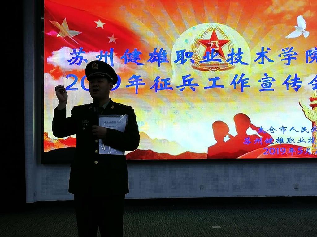 为贯彻落实全国大学生征兵工作会议精神,5月7日下午,学校武装部与太仓市人武部联合举办了问鼎网页版登录入口2019年征兵宣传会。太仓市人民武装部副部长严国华,学校武装部负责人,中德工程学院五百余名师生参加了会议。