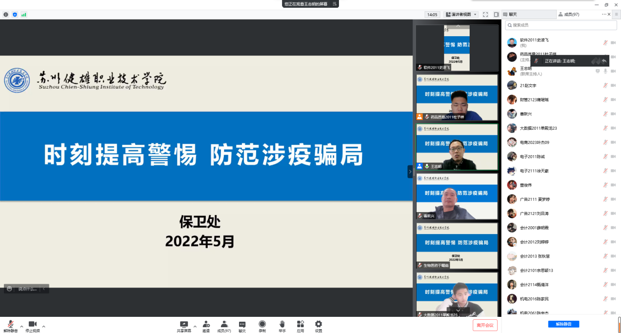 保卫处王志明做了《时刻提高警惕 防范涉疫骗局》的主题交流,重点介绍了疫情流调、信息摸排、疫情期间招工、冒充染病人员、代购防疫物资、冒充班主任等十类涉疫骗局,希望各位同学在严格遵守居住地疫情防控规定,做好个人防护的基础上,提高防骗本领,做到防控疫情和防范诈骗两不误。(图/文 王志明 审核/曹跃兴)