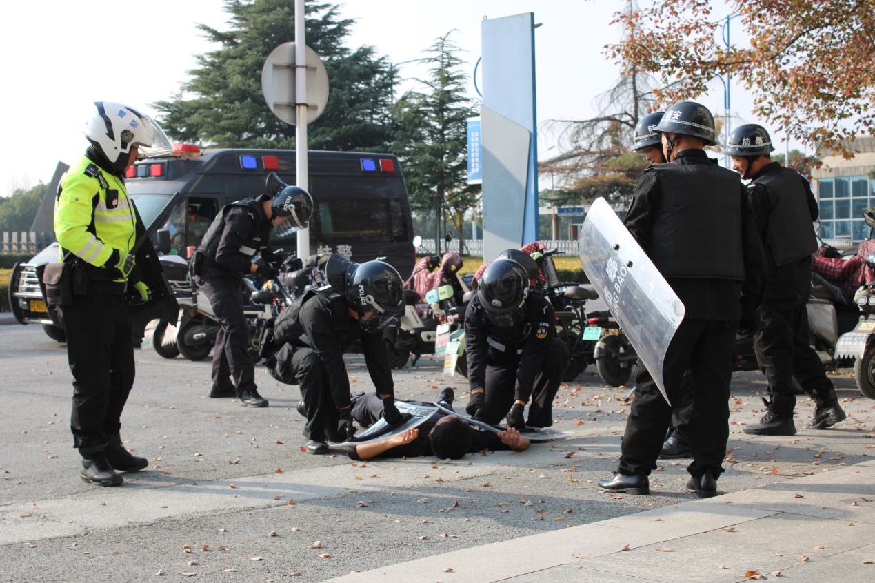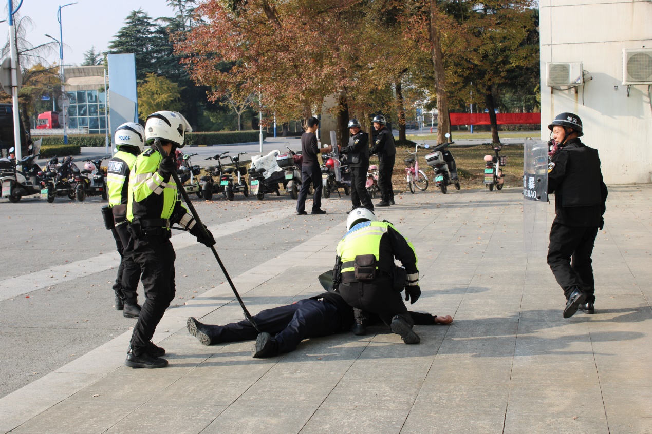 为进一步提高安保人员应急处突能力,做到有效应对、迅速处置,11月29日,保卫处联合科教新城派出所开展反恐防暴应急演练活动,科教新城派出所民警、保卫处负责人和物业公司保安共20余人参加演练。