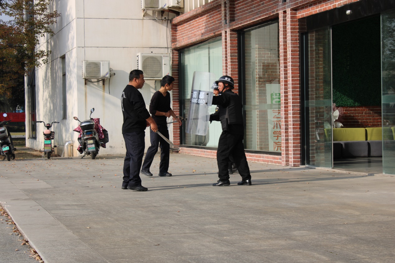 演练前,保卫处与科教新城派出所设定了具体场景,对演练各个环节和人员安排进行了周密部署,明确了参加演练人员的工作职责和注意事项。演练开始后,两名“危险分子”企图冲进校内教学场所袭击学生,其中一名“危险分子”手持砍刀,保安发现异常情况后立即拨打报警电话,同时使用防暴器械与“危险分子”周旋。科教新城派出所在接到报警后,迅速组织警力携带警械赶赴现场处置。到达现场后,民警与学院安保人员分工合作、密切配合,迅速将“危险分子”制服并带离现场。演练结束后,科教新城派出所杨警官对整个演练过程进行了总结,并从安全防范、处置技巧等方面对参加演练的人员进行培训讲解。