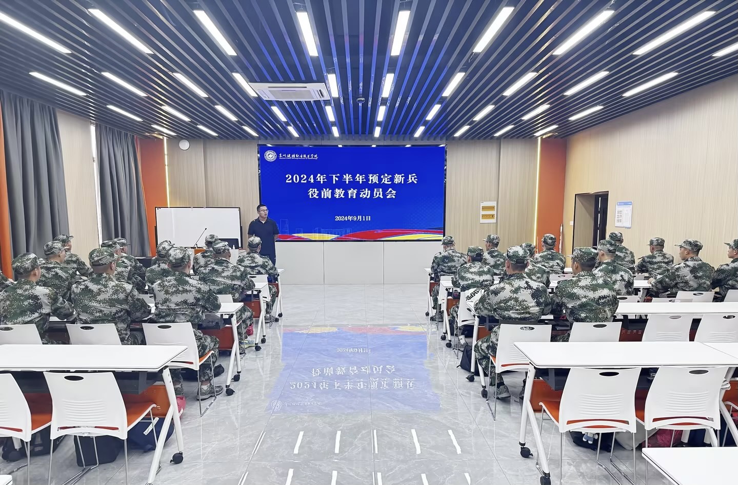 9月1日下午,学院武装部在西校区D1-101召开2024年下半年预定新兵役前教育动员会,武装部负责人、役前教育骨干及27名预定新兵参加会议。
