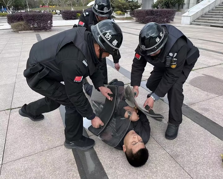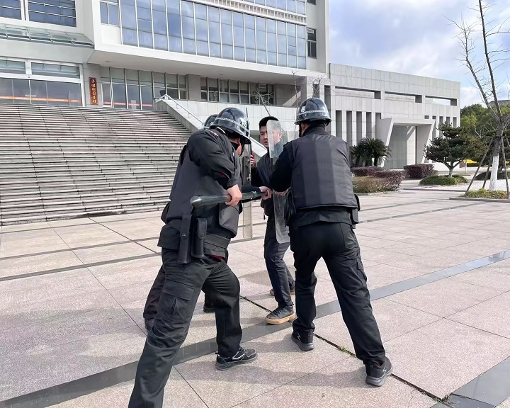 3月5日下午,保卫处联合属地派出所在校园开展防暴应急演练。演练模拟“可疑人员持械强行闯入校园”场景,安保人员迅速启动应急预案,通过一键报警装置联络警方,同时利用防暴盾牌、钢叉等器械与“危险分子”周旋,成功将其制服并移交警方。演练全程紧张有序,有效检验了安保队伍的快速反应能力、协同作战能力和突发事件处置水平。演练结束后,保卫处负责人对防暴器材使用、人员分工配合等环节进行复盘总结,要求全体安保人员时刻绷紧安全弦,切实守护师生生命安全。