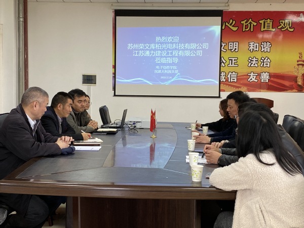 11月26日,苏州荣文库柏光电科技有限公司和江苏通力建设工程有限公司民建党成员来我校交流合作,电子信息学院副院长高飞和沈健老师进行了热情接待。