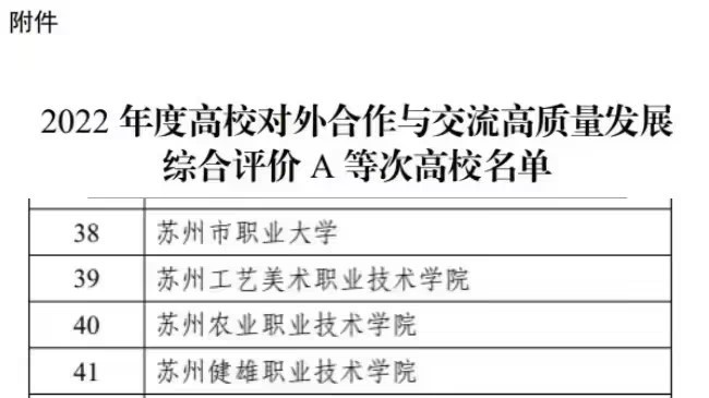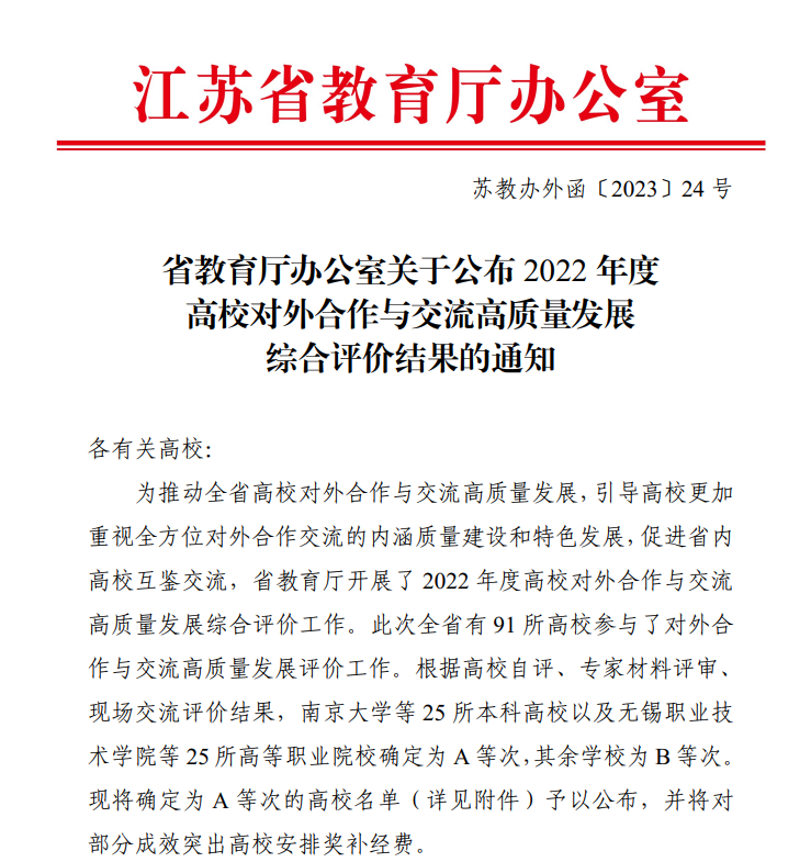 江苏省教育厅于4月在全省范围内开展了2022年度高校对外合作与交流高质量发展综合评价工作。根据高校自评、专家评审、现场交流等评价过程,问鼎(中国)最终获评2022年度高校对外合作与交流高质量发展综合评价A等高校(苏教办外函〔2023〕24号),省内共25所高职院校获评考核A等,其中苏州地区为4家。