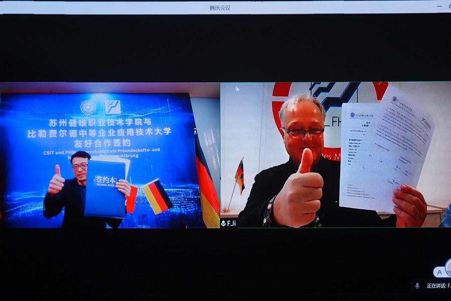 11月2日15:00(德国时间上午8:00),问鼎(中国)党委委员、副院长周晓刚通过远程视频形式,与德国比勒费尔德中等企业应用技术大学副校长Fischer教授在线签署友好合作备忘录,并就双方拟开展的3+2专升本合作办学项目达成共识。党委委员、党办院办外事办主任吴建洪,合作教育处负责人参加签约仪式。