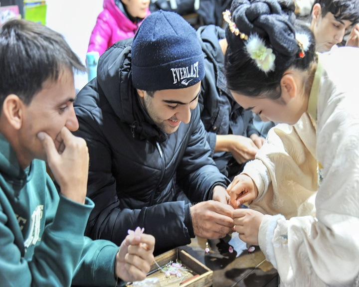 在制作环节,留学生们热情高涨,纷纷拿起材料,在老师们的耐心指导下开始尝试。他们小心翼翼地将丝线缠绕在铜丝上,逐步塑造出花瓣和叶片的形状,尽管手法略显生疏,但每一个人都全神贯注,沉浸在这一传统手工艺的创作乐趣之中。经过努力,一片片栩栩如生的花瓣和叶片在留学生们的手中诞生,他们将这些部件组合在一起,完成了属于自己的缠花作品。虽然这些作品并不像专业手工艺人制作的那般完美,但每一件都饱含着留学生们对中国非遗文化的热爱与独特理解。