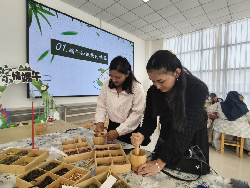 艾草香包的DIY环节洋溢着趣味与创意。留学生们精心挑选新鲜的艾叶,并搭配印有“平安喜乐”“百毒不侵”等吉祥文字的装饰品,亲手制作出可供悬挂的香包。