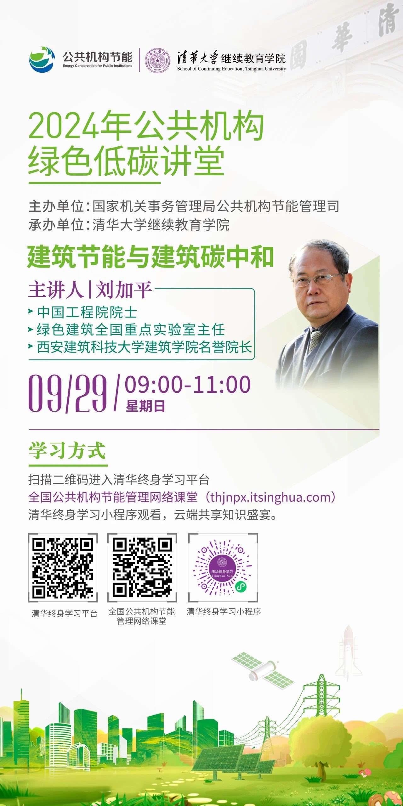 为全面贯彻落实党的二十届三中全会精神,充分发挥公共机构在节约能源资源中的示范引领作用,加快推动公共机构绿色转型,9月29日(周日)上午9:00,国管局节能司将通过清华大学云课堂平台举办2024年第三期公共机构绿色低碳讲堂,邀请中国工程院院士、绿色建筑全国重点实验室主任、西安建筑科技大学建筑学院名誉院长刘加平,以“建筑节能与建筑碳中和”为主题进行授课。请各部门积极组织全体人员参与学习。