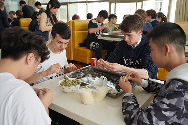 饺子是中国的传统美食,而自己动手包饺子更增添了一大乐趣。在学校食堂,食堂师傅、老师、学生,一起学包饺子、交流技艺,品尝饺子,谈论中国美食,其乐融融……