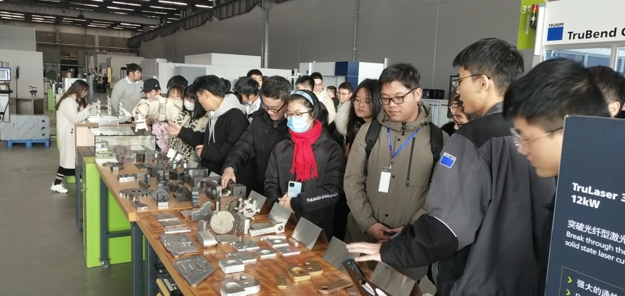 在通快公司同学们认真倾听了公司发展的历程与发展前景,并在机床事业部生产车间观察了高档数控激光切割机床的操作与控制,在现场工程技术人员的介绍与鼓励下,大家还亲手切割与小象、通快徽标等作品,进一步感受到了德资企业先进制造技术的魅力。在企业生产现场,工程技术人员把刚刚切割成型的作品作为实习礼物送给了同学们,引起大家浓烈的兴趣与学习热情。参观实习结束后,大家高兴的在企业门口合影留念。