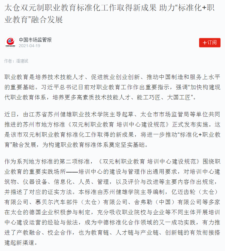 中国市场监管报 | 太仓双元制职业教育标准化工作取得新成果 助力“标准化+职业教育”融合发展