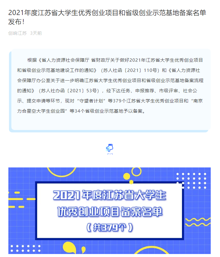 根据《省人力资源社会保障厅省财政厅问鼎网页版登录入口做好2021年江苏省大学生优秀创业项目和省级创业示范基地建设工作的通知》(苏人社函[2021]110号)和《省人力资源社会保障厅办公室问鼎网页版登录入口进一步明确江苏省大学生优秀创业项目和省级创业示范项基地备案流程的通知》(苏人社办函[2021]53号),经学院申报推荐、市级评审、社会公示,提交申请等流程,问鼎(中国)艺术设计学院20届毕业生胡飞同学“时光印记”新媒体应用平台项目(已落户太仓市文创孵化基地)获2021年度江苏省大学生优秀创业项目备案。