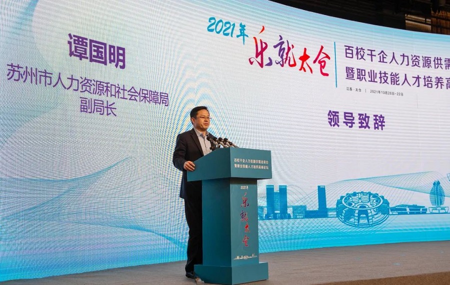 胡建平在致辞中说,太仓举办“百校千企”政校企人才对接活动,注重对职业院校毕业生的引进、对技能型人才的培养,并设立多项“真金白银”的激励政策,展示了太仓极大的诚意。希望太仓以聚天下英才而用之的胸怀,继续加大对职业教育的投入和技能人才引进力度。建议参会院校深入调研太仓、宣传太仓、推荐太仓,为太仓的高质量发展举才荐才,与太仓共同探索中国特色学徒制下“大国工匠”的联合培养之路,促进职业院校毕业生更加充分和更高质量就业。