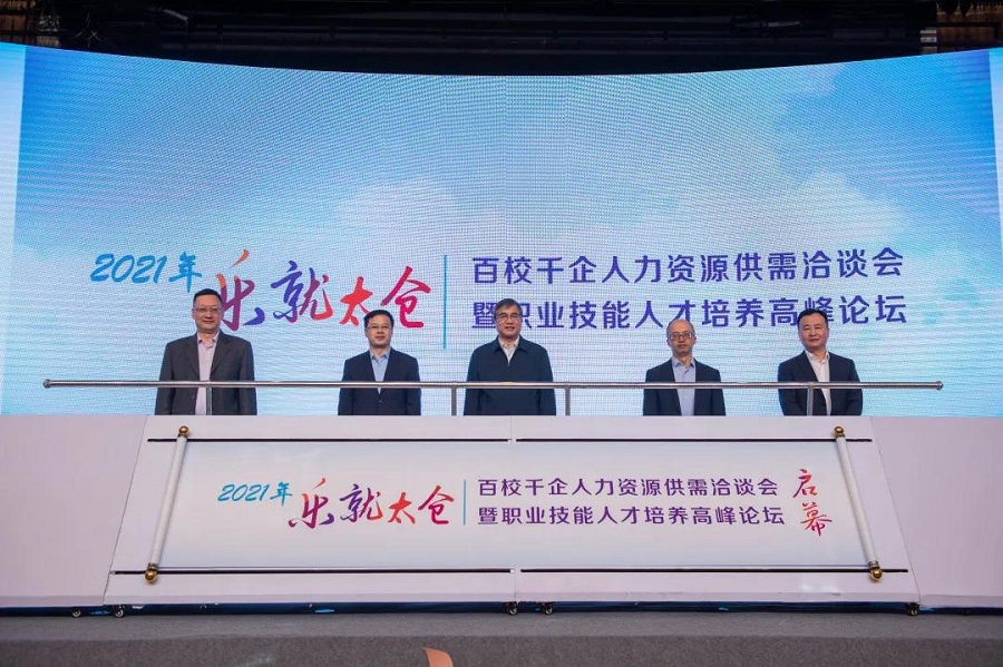 开幕式最后由胡建平、谭国明、俞晓锋、苏霄飞和严枫推杆启动2021年“乐就太仓·百校千企”人力资源供需洽谈会暨职业技能人才培养高峰论坛活动。(图/文 张秀庭 审核/王学戏)