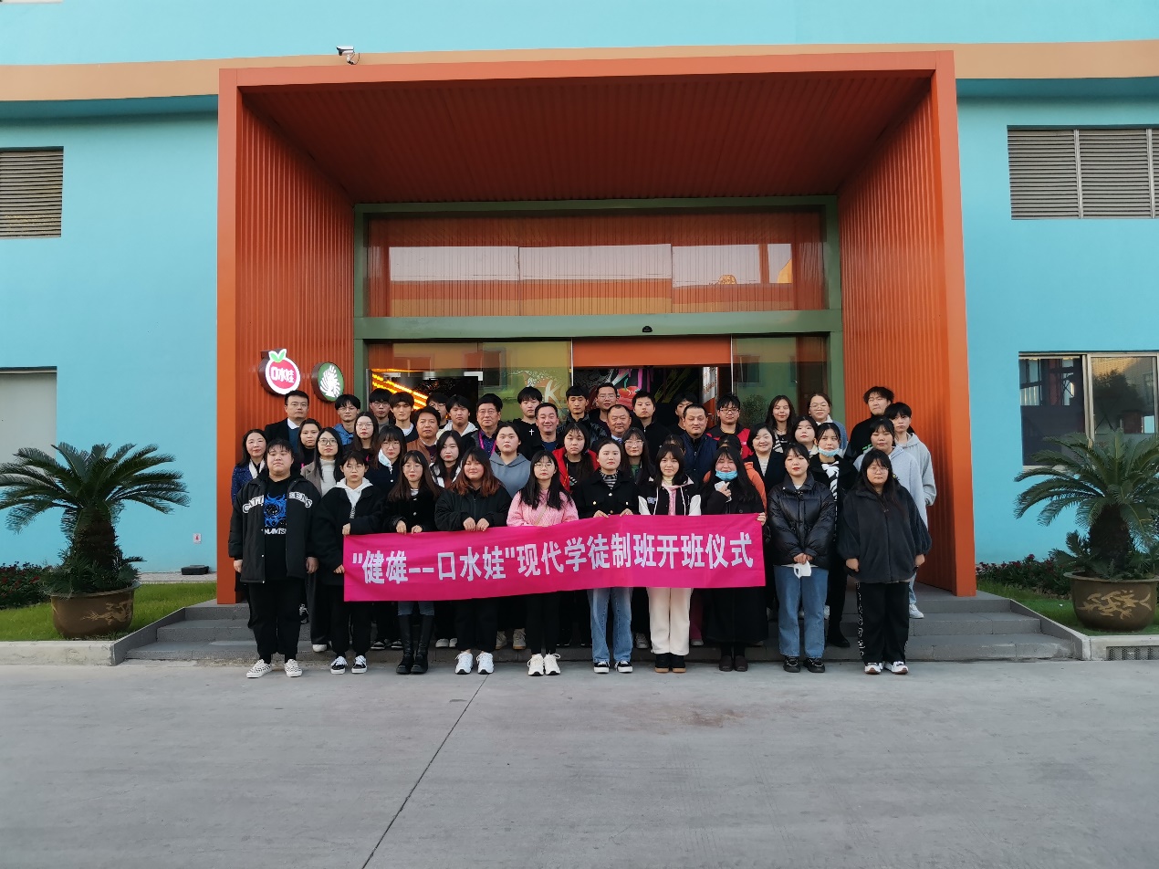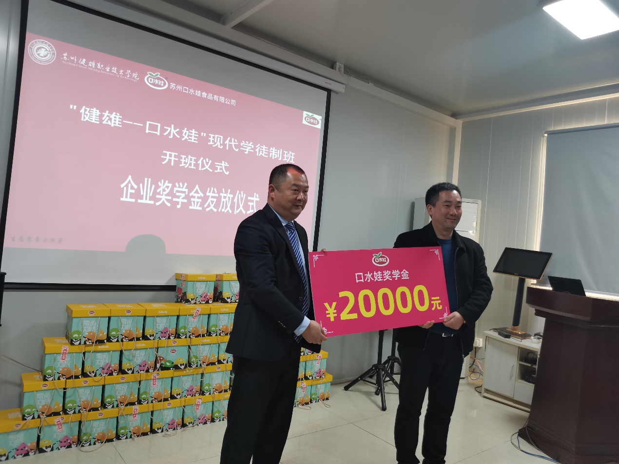 在“健雄-口水娃”现代学徒制班开班仪式上,口水娃食品有限公司捐赠学生奖学金2万元;校企双方签署了《合作建设健雄“双元”师资培养工作站协议》、《毕业生就业基地协议》;