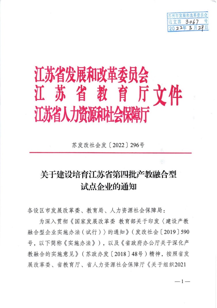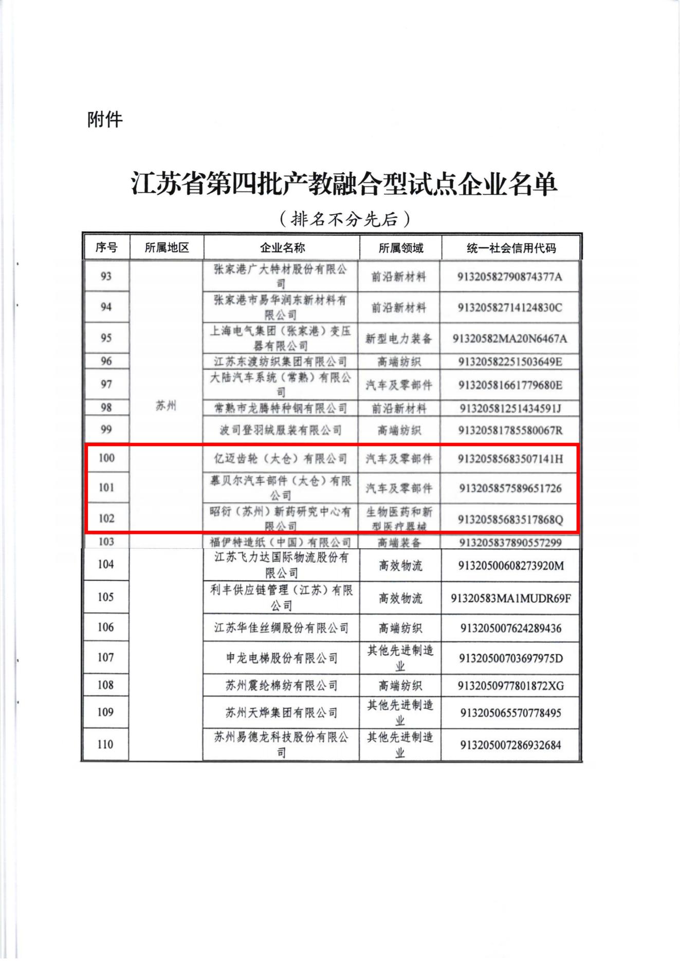 近日,江苏省发展改革委、省教育厅、省人力资源保障厅联合发布了江苏省第四批产教融合型试点企业名单,我校校企合作企业亿迈齿轮(太仓)有限公司、昭衍新药研究中心(苏州)有限公司、慕贝尔汽车部件(太仓)有限公司等3家企业成功获批认定全省第四批产教融合型试点企业,并纳入省产教融合型企业建设培育库,至此我校重点合作企业入围累计已达4家,实现我校产教融合型企业合作培育质量的全面提升。
